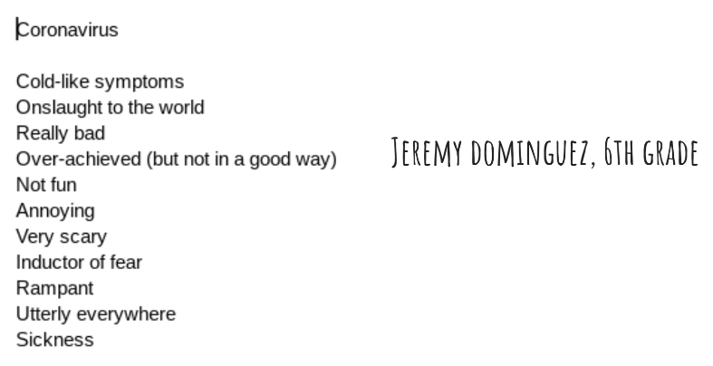In collaboration with Citizen Schools, we completed our creative writing apprenticeship. Several remarkably attuned middle-school students continued to show up for distance learning and produced some stunning works of reflection on the pandemic, such as Jeremy’s acrostic poem, and other topics, such as Angel’s longing for homeland.