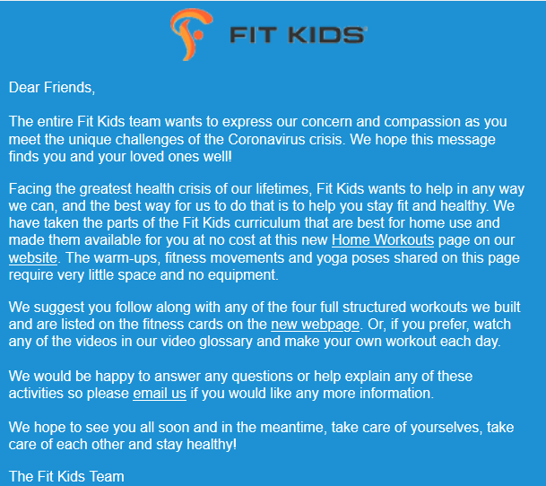 Inkflow client Fit Kids released its new series of Home Workouts via the e-blast below. School closures during the Coronavirus crisis limit even further the scant fitness resources in the disadvantaged communities where Fit Kids operates.
