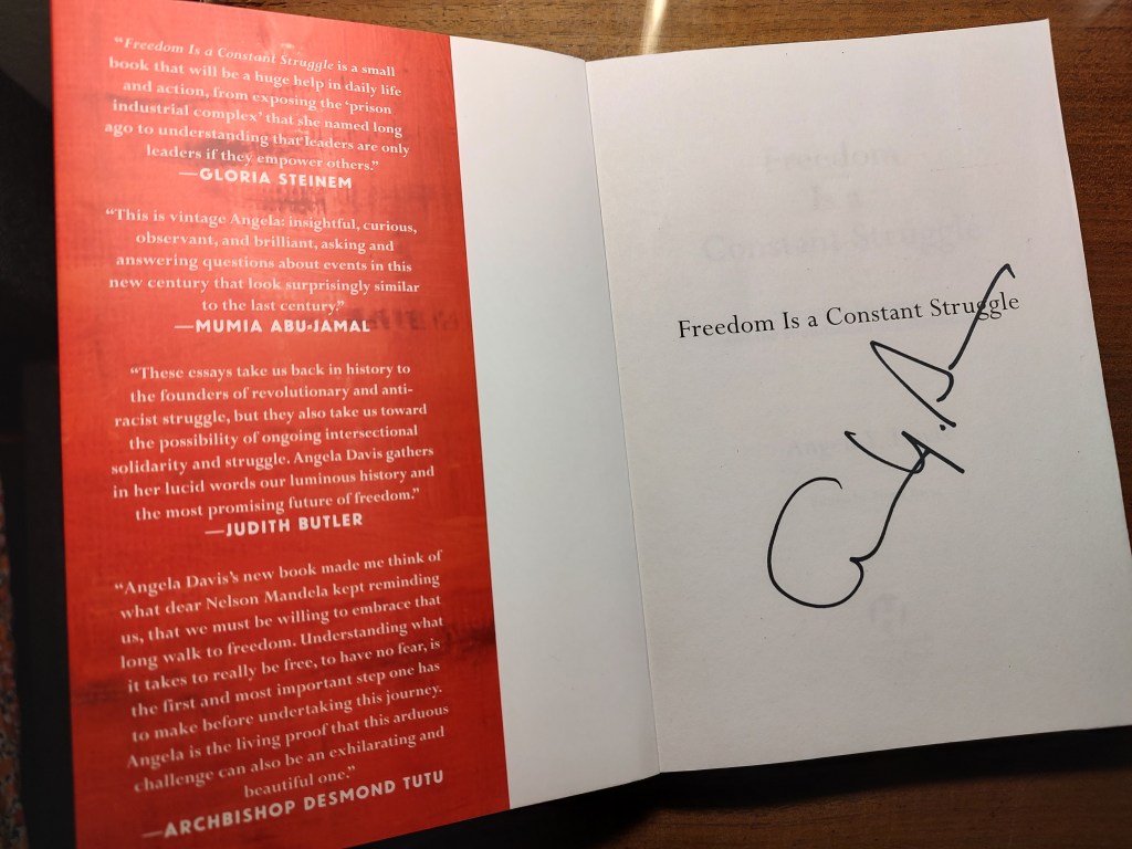 In-between, there were personal reunions, handshakes, hugs, back-slaps and shouts. Blanche ran out of copies of Comrade Sisters to be sold and signed. Fortunately, I’d brought my dog-eared copy of Freedom Is a Constant Struggle, so I stood in line for an hour after the presentations until it was my turn for Angela Davis to sign.