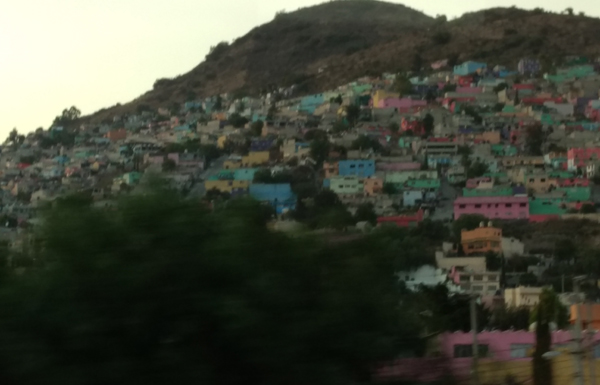 We met our shuttle to Teotihuacan at the hotel and picked up another dozen or so guests at various hotels. The shuttle wound through some now-familiar streets down to Zocalo before heading north through the poorest-looking streets we’d seen yet and then onto a wide highway that passed through miles of industrial ugly followed by more miles of piles of rubble disguised as houses, stacked improbably into hillsides, the brilliant pastels of their exteriors at odds with whatever pains of poverty lurked inside.