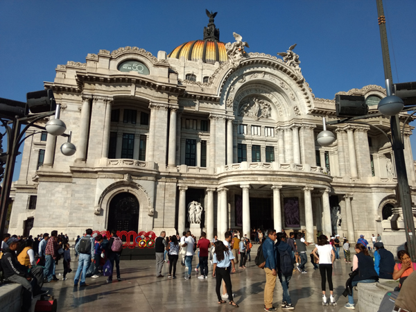 The bikes were due back by 3. We rested and phoned my former colleague and Mexico City native Raul Escalante, who suggested how to spend the hours before he could meet us at the hotel at 8:30 to give us a night-time driving tour. On Raul’s advice, we Ubered to Palacio de Bellas Artes. Entering the Centro Historico district, traffic slowed to the typical congested pace of New York or Chicago. We felt compelled to explore more widely than deeply, so we spent just a few minutes admiring Bellas Artes.