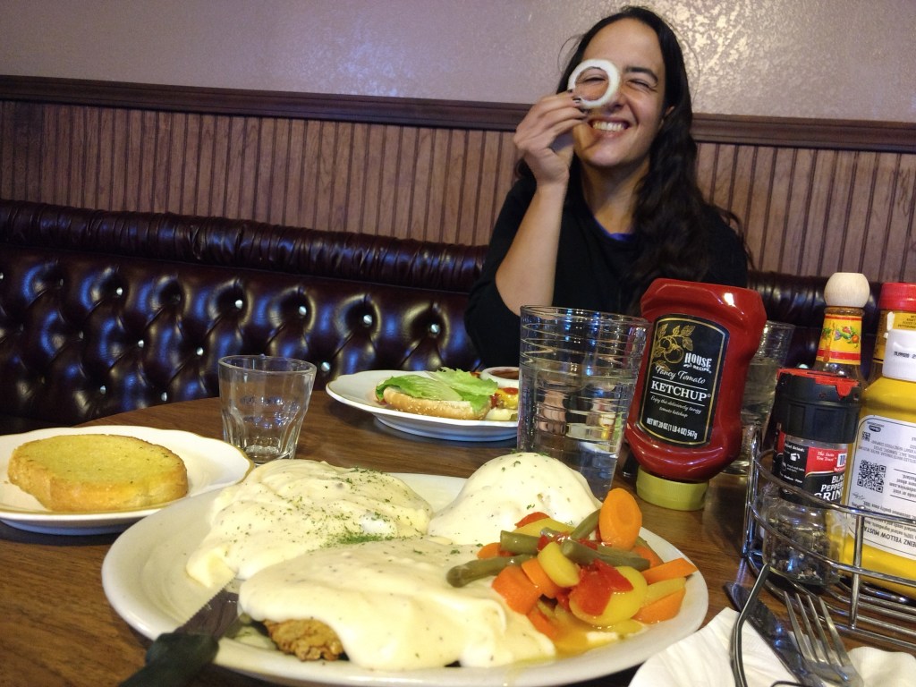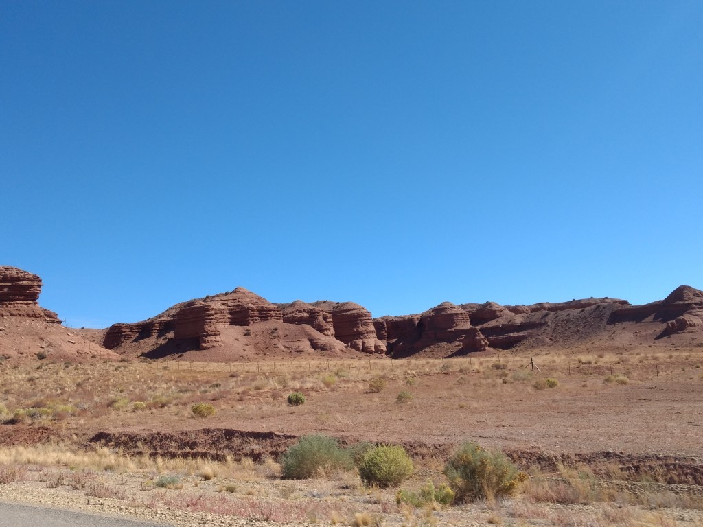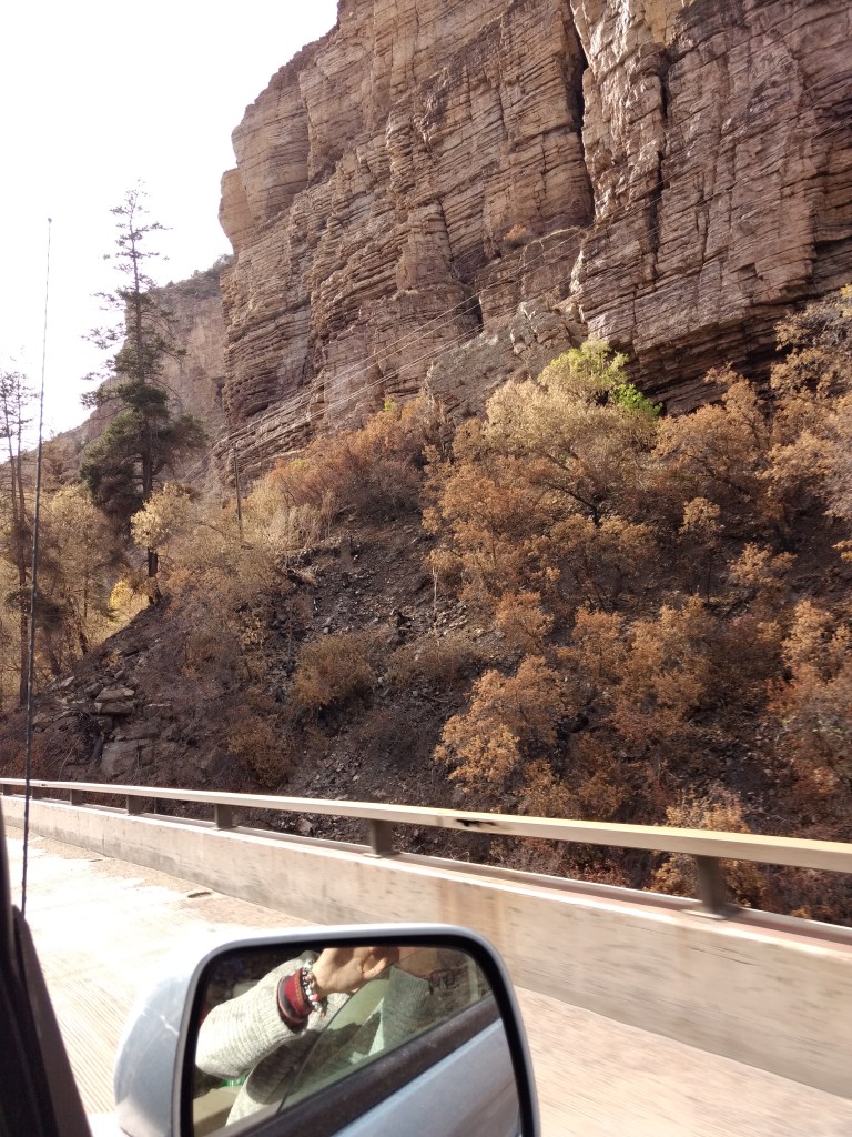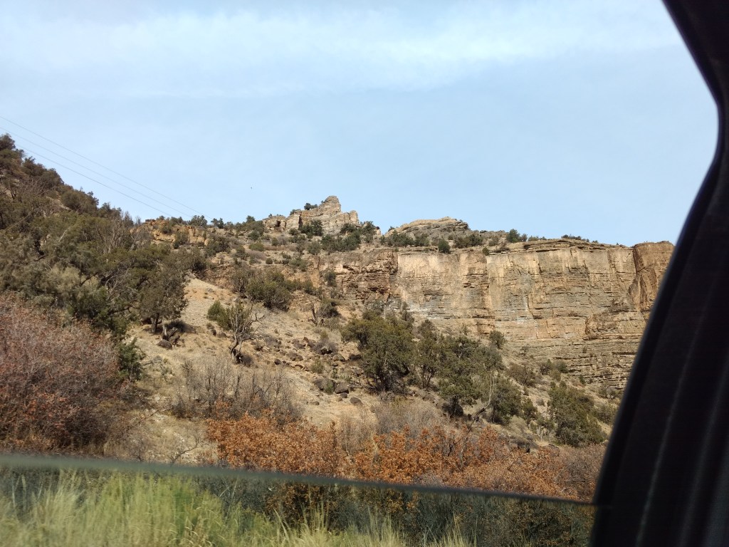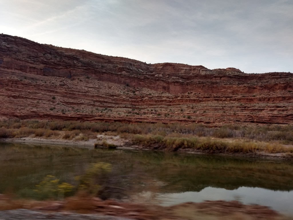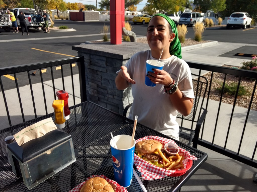Other specific memorable moments were opening the lid on our hand sanitizer and having it shoot a shot that splatted on Eleni’s passenger seat a few inches from her eyes and our search for fast food in Grand Junction leading to Qdoba until the sudden sight of the sign for Freddy’s Steakburgers dragged me across three lanes of traffic and into two rounds of burgers and chicken sandwiches and pumpkin pie shakes. That held us until we hit 128, which winds about forty-five miles along the Colorado River.