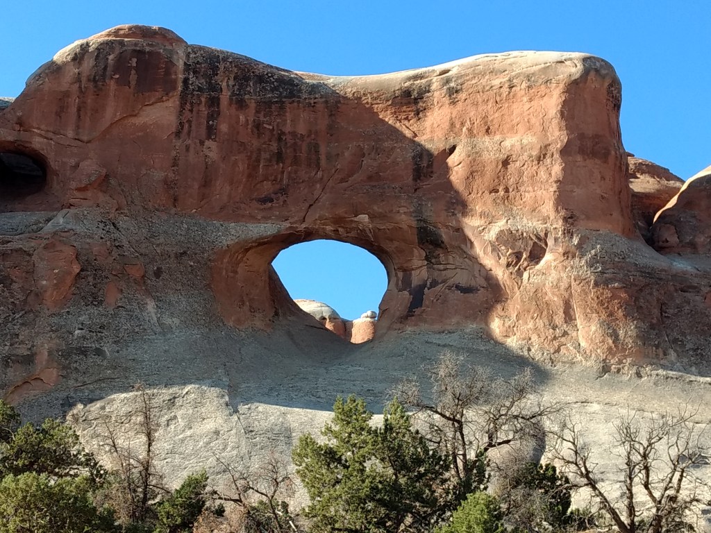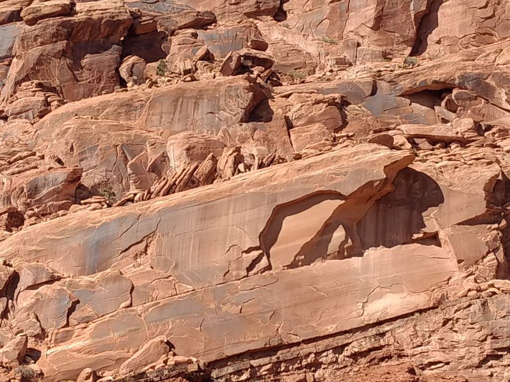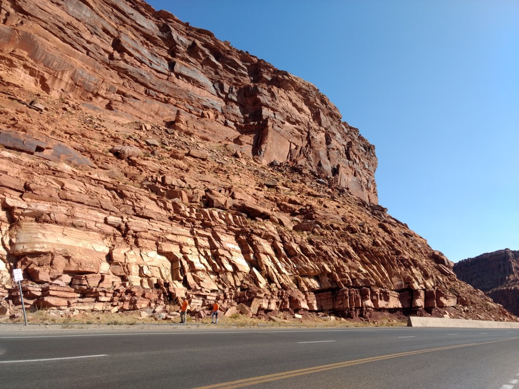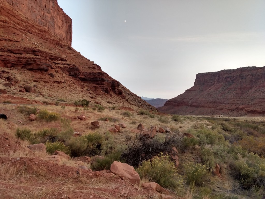 At dark, we drove into Moab for a light bite and drove back out 128 to a boondock site.The next morning, we woke up at 6:30, did gymnastics into the front seat, and bee-lined past the rock faces visible in the dawn for the Denny’s at the edge of town. It was closed. I’d never seen a closed Denny’s. It was open the night before. Maybe it was a fluke Covid-related event. As cosmically disconcerting as a closed Denny’s was, we accepted the universe’s gentle nudge toward the much more mom-and-pop Jailhouse Café for coffee and what their menu listed as “soul bacon,” which was bacon.