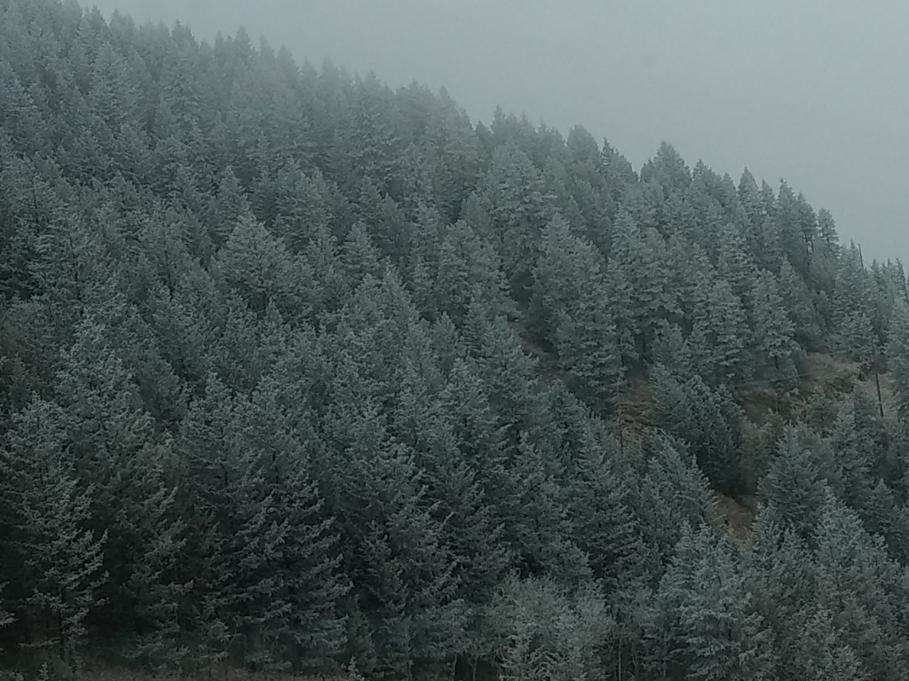 A major accident on Highway 70 slowed us down for a couple hours. We enjoyed views of frosted treetops towering above the freeway and those at eye level, maybe just fifty to seventy feet lower, that were still their usual deep green.