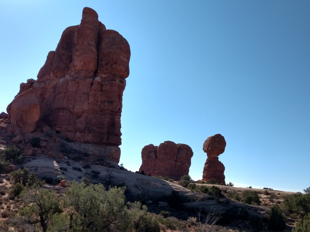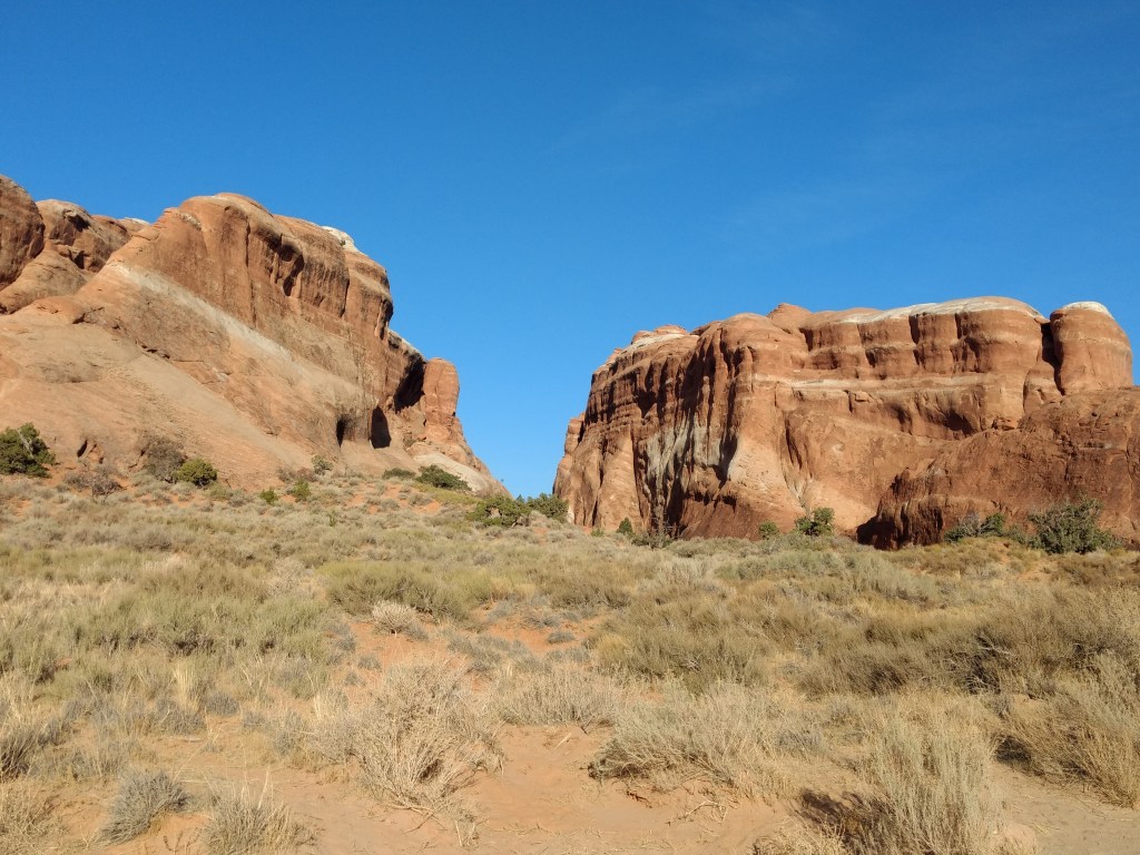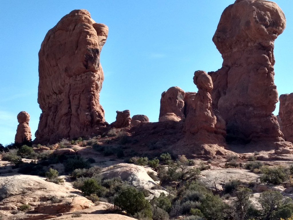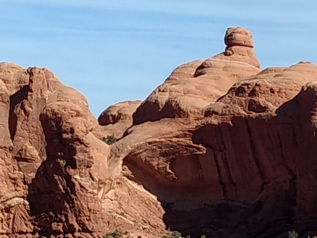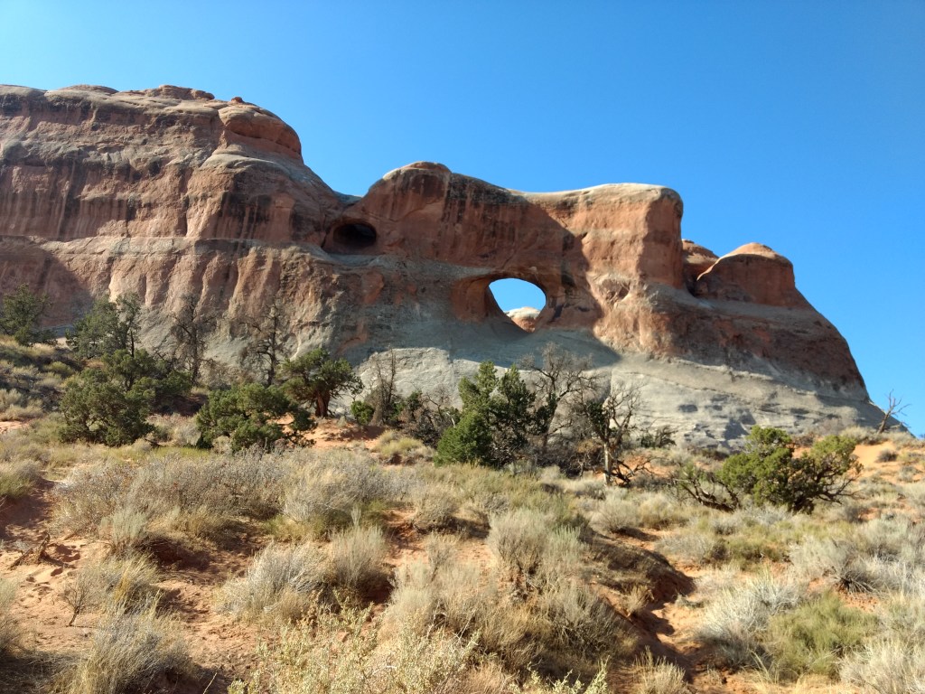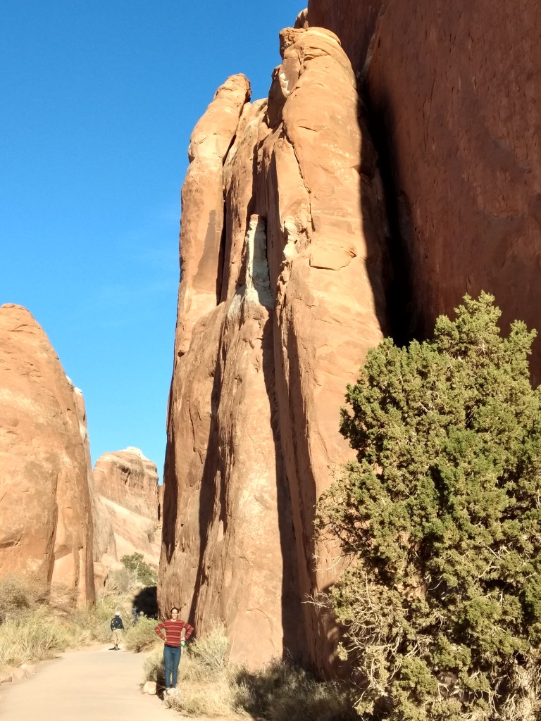 Arriving at Arches around 8 a.m., it was too late to hike out to Delicate Arch for sunrise or whatever you’re supposed to do, so we just drove and checked stuff out and stopped whenever something awed us more than whatever else was aweing us. We made friends with random hikers, like the guy in a Bears sweatshirt and Cubs hat, who I talked sports and neighborhoods with, and then a little Latino kid, sprinting ahead of his family in a walking cast for his broken foot, but irrepressible and oblivious to pain just to be free in such beauty.